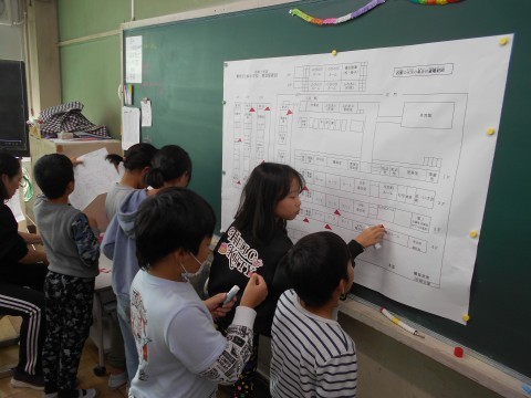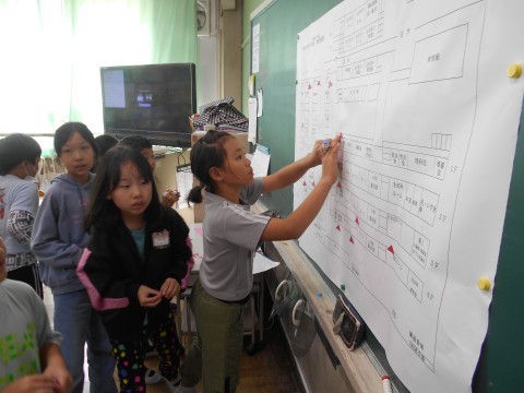 1組は大きな校舎配置図に、調べてきた消火器設置場所をマークしました。