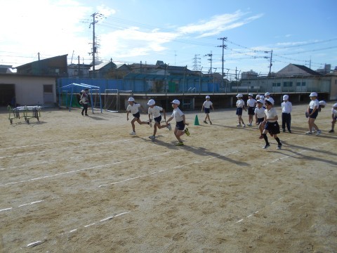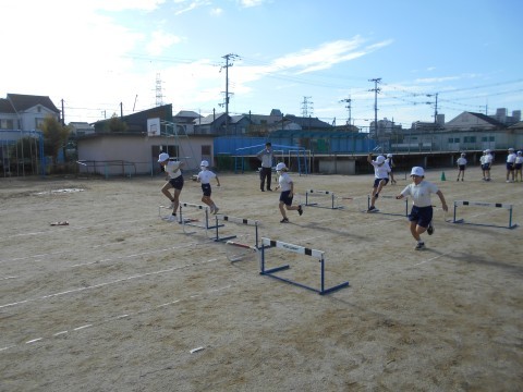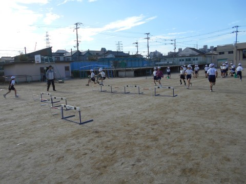 ハードルの隣にはミニハードルを置き、「またぎ越す」感覚をつかみます。