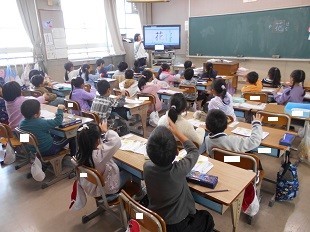 また,国語では漢字の「花」を学習しています。書き順をみんなで手をあげて練習しています。