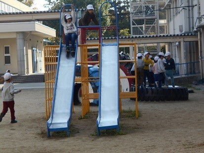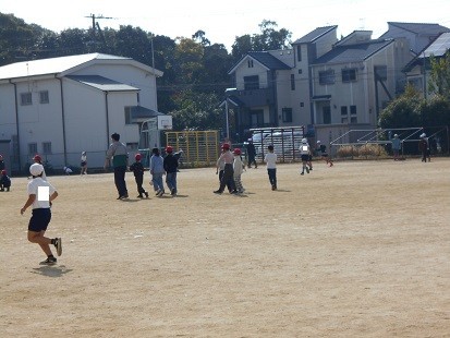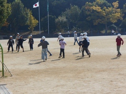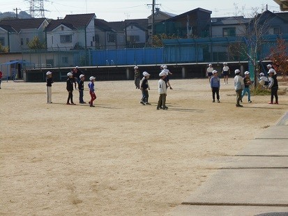 元気に外で遊んでいる子どもが多いです。1年生の子どもたちは,みんなで保育園のお友だちを見送りました。