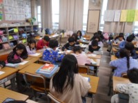 問題数の多いかけ算プリントをみんなで解いて、添削しています。