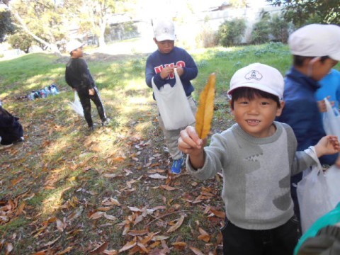 たくさんのドングリや、すっかり黄色や赤に染まった葉っぱを拾いました。