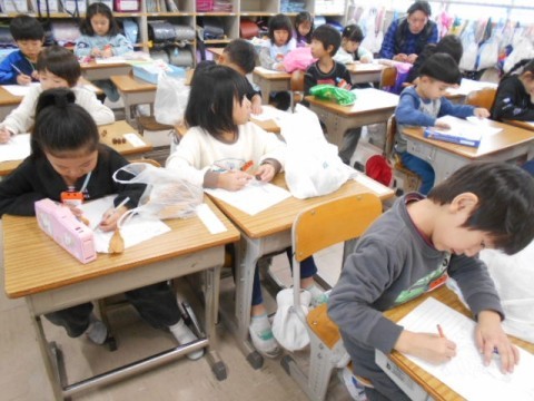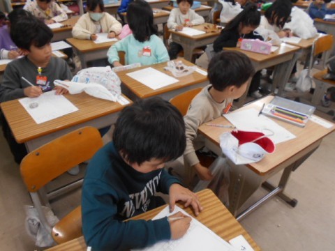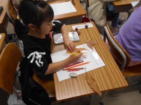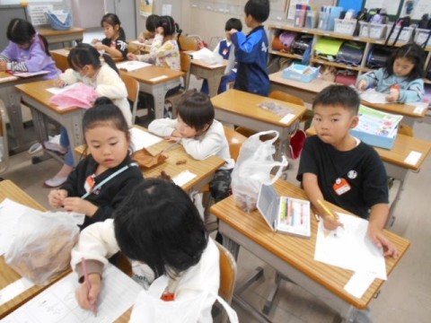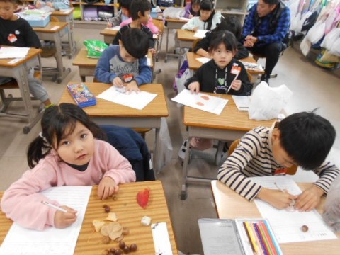 1年1組では、今日拾いに行ったドングリや落ち葉を早速記録していました。