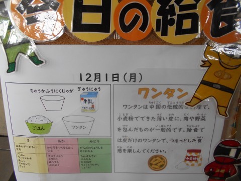 ワンタンは中国の伝統的な料理です。小麦粉でできた薄い皮に肉や野菜を包みます。給食では,皮だけのワンタンです。食感を楽しみましょうね!