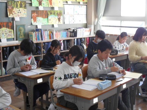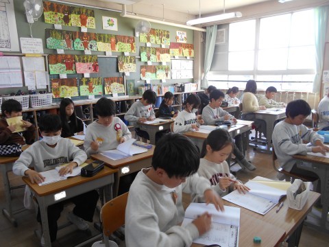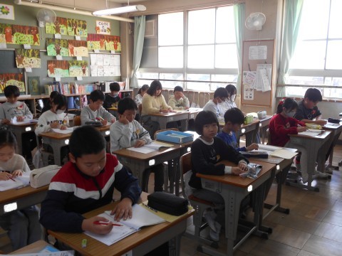 4年3組は今朝の朝学習をした問題の答え合わせ中でした。