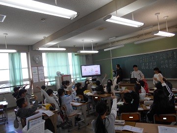 新出漢字の学習では,係の児童が前に出て学習を進めています。