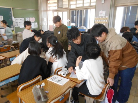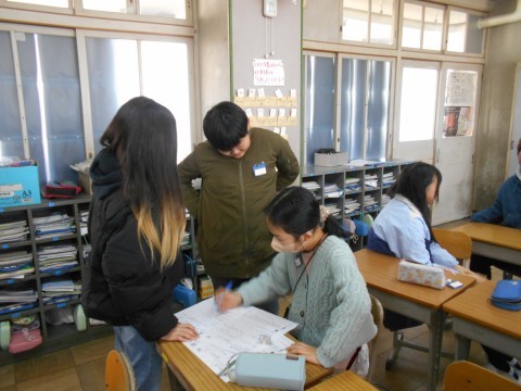 6年1組では、友だちに相談しながら算数の復習プリントをしていました。