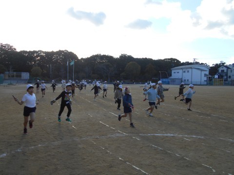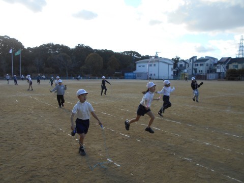 まだ暗がりがあるように見える大仙公園の方から、縄跳びを回しながら走ってくるのは2年生の集団です。