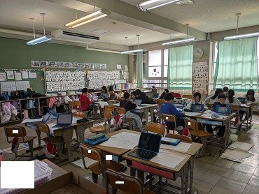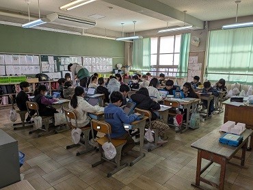 図工では版画を印刷しています。また,社会科では,新しいタブレットを使って調べ学習をしています。