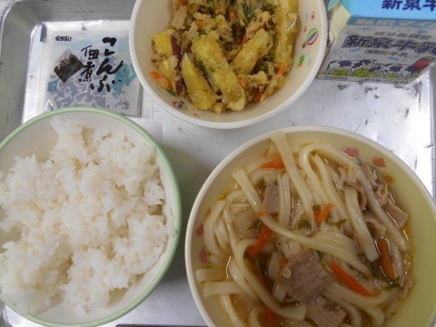 給食では,豚肉とうどんが入った「はりはりうどん」です。