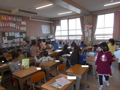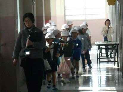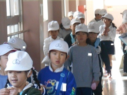 1年生が体育に向かいます。きちんと並んで静かに移動しています。