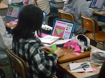 折り紙クラブでは,タブレット端末を見ながら折り紙を折っています。