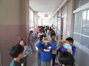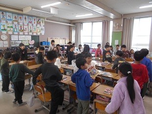 授業のはじめの挨拶をしたあと,学校図書館に向かっています。