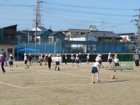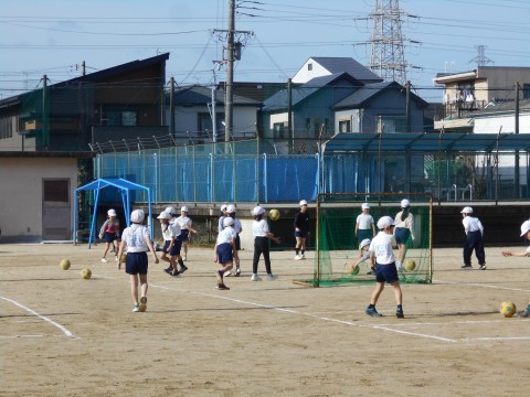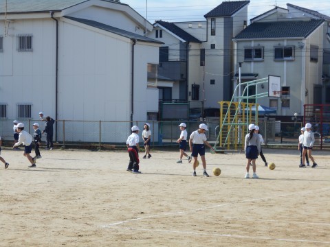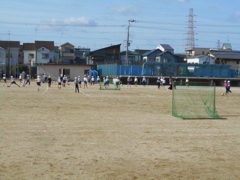2年生は合同体育。運動場でサッカーをしていました。