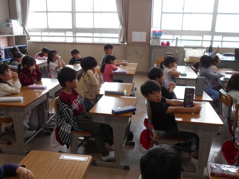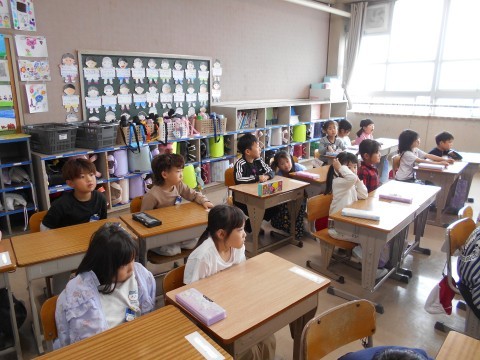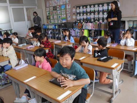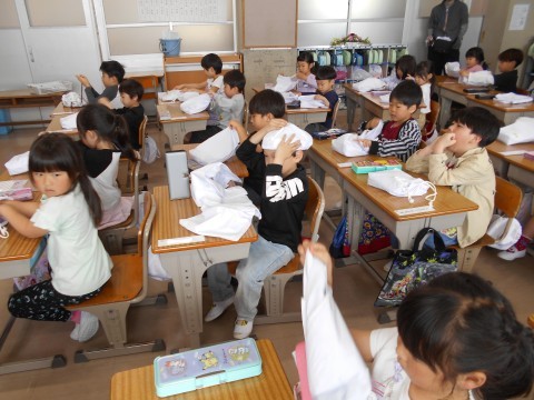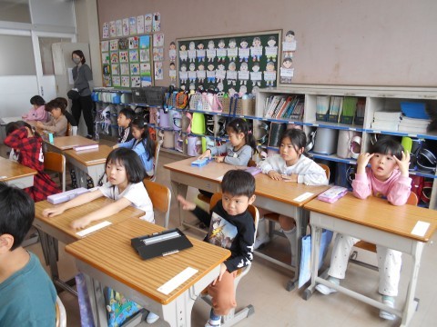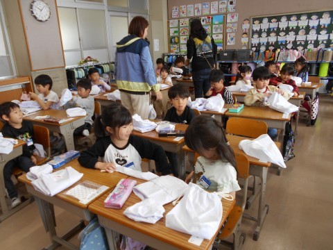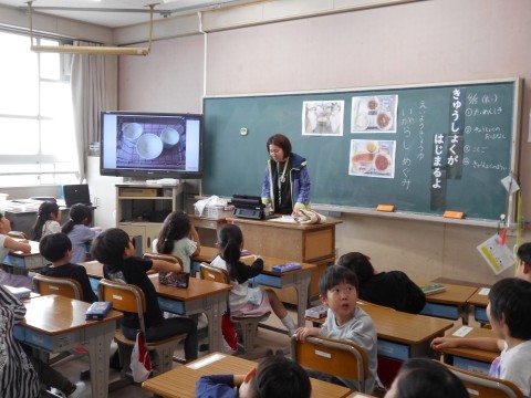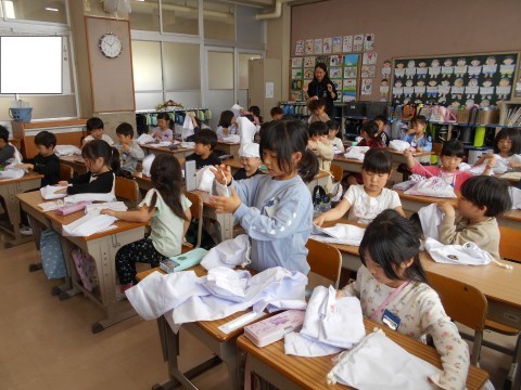 1年生の教室に栄養教諭の先生が来て、給食の準備・片付けの方法を教えてくれました。
