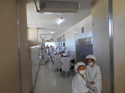協力して,がんばって,給食を運びます!