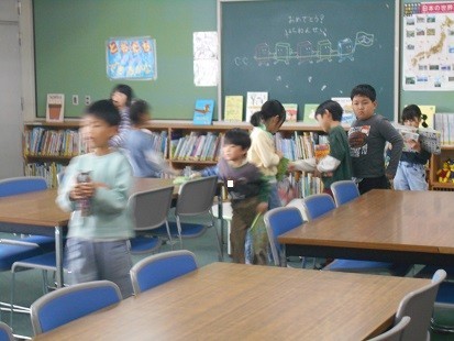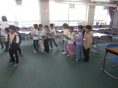 図書の時間の様子です。司書さんの説明を聞いて,本を借りたり返したりしています。