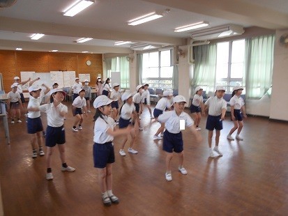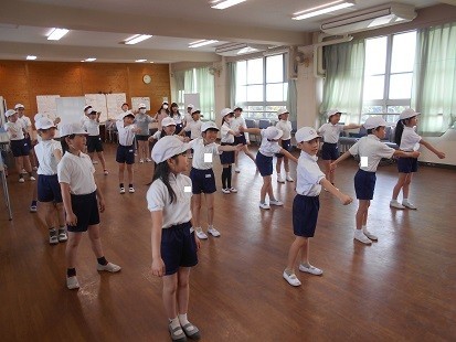 雨が降っているので,総合の部屋で「新・さかいっ子体操」の練習をしています。