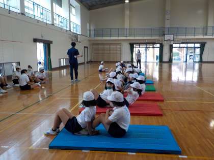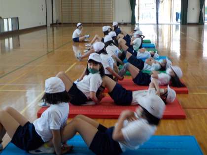 上体起こしの様子です。例年ですと,足を持つ人は,向かい合っていますが,今年はコロナ対策で,後ろ向きに座って対面にならないように,実施しています。
