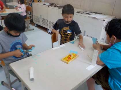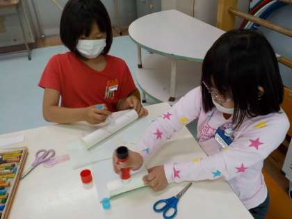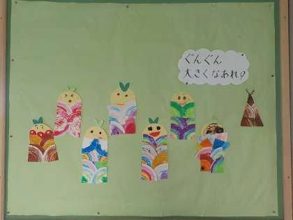 今日は以前制作した、たけのこの壁面制作の続きをしました。横につける竹をサランラップの芯を使い、緑の折り紙を巻き付けていきました。くるくると上手にのりで貼ることができました!また、雨のしずくにかわいい顔を書いたり、たけのこをさらにニョキニョキ伸ばしたりと壁面がどんどん進化していっています。