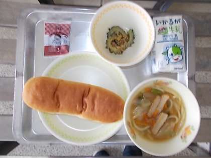 本日のメニューは「沖縄風ラーメン・ゴーヤーチップス・チョコレートクリーム・コッペパン・牛乳」でした。