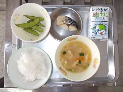 本日のメニューは「かぼちゃのみそ汁・焼きさば・えだまめ・ごはん・牛乳」でした。