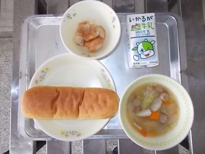 本日のメニューは「スープ煮,ポヨ・アラ・ブラサ,コッペパン,牛乳」でした。