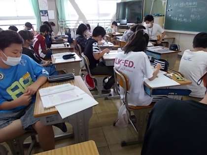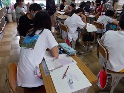 1組では,算数でおうぎ形の面積について,学習していました。おうぎ形に1立方センチメートルのマスを重ねた図を使って,考えていました。