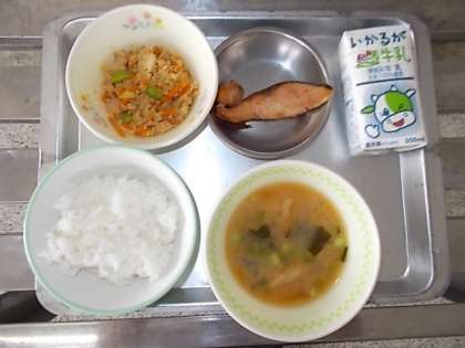 7月8日木曜日 今日の給食 本日のメニューは「そぼろ丼・みそ汁・焼き鮭・牛乳」でした。