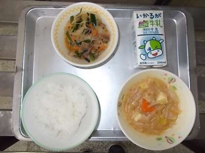 本日のメニューは「とうふみそチゲ・春雨のいため煮・ごはん・牛乳」でした。