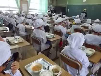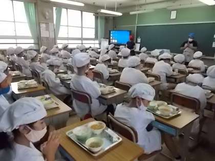4年生の教室では「いただきます」を言って食べ始めるところです。