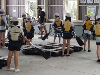いかだチームは,パドルを使った進み方や曲がり方を教わりました。