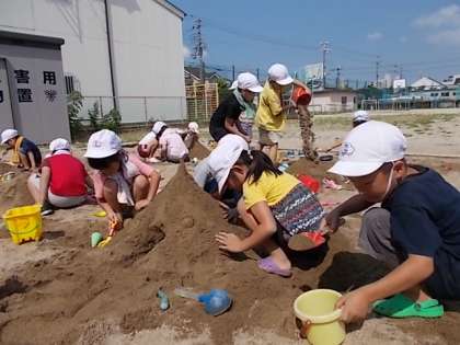 班の友だちと「あなをほろう」「大きな山をつくろう」「おだんごをつくろう」と相談し,力を合わせて作っていました。