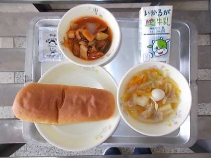 本日のメニューは「うずら卵入り野菜スープ・鶏肉のラタトゥイユ・きなこクリーム・コッペパン・牛乳」でした。