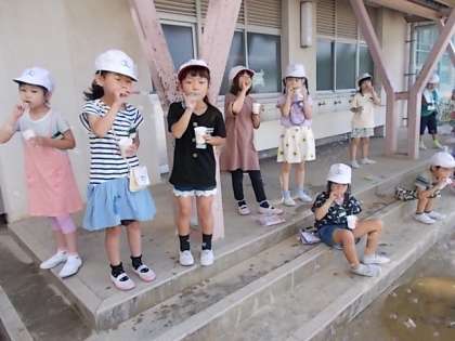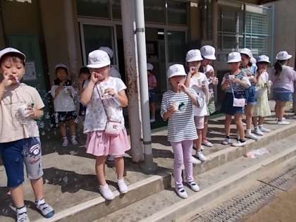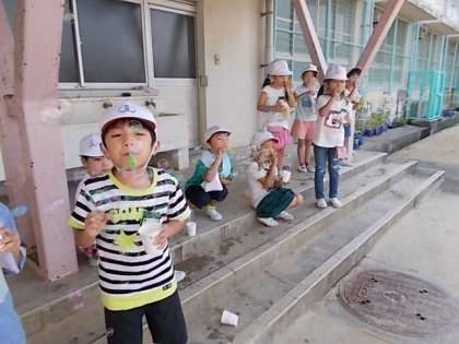 シャボン玉をする前に,「大きいシャボン玉と小さいシャボン玉の作り方を考えながらふいてね」と伝えておくと,ふき方を工夫して,大きいシャボン玉も,小さいシャボン玉も作っていましたよ。