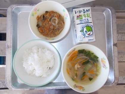 本日のメニューは「はるさめスープ・マーボーなす・ごはん・牛乳」でした。