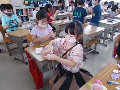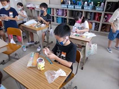 紙粘土を使って鉛筆立てを作りました。思い思いの作品に仕上げていました。