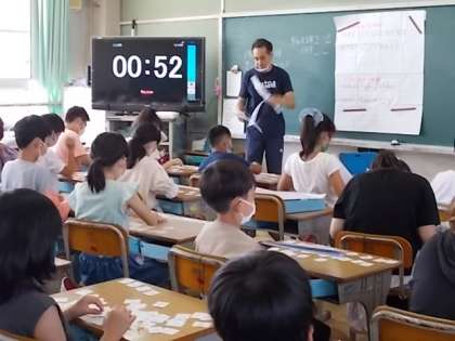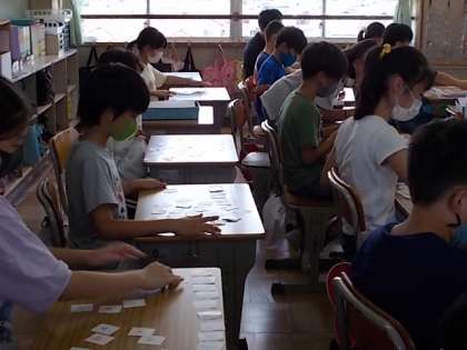 4年生,外国語活動のようすです。今日は,アルファベットを学習していました。カードをアルファベット順に並べています。字の形を覚えないといけないし,順番もおぼえないといけないですね。できたかな?