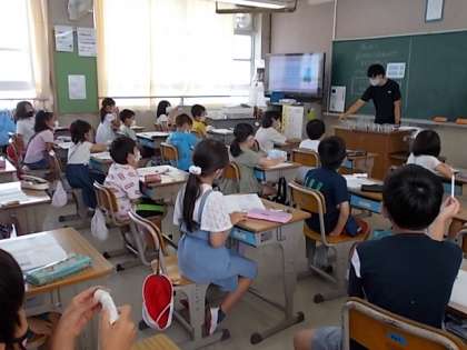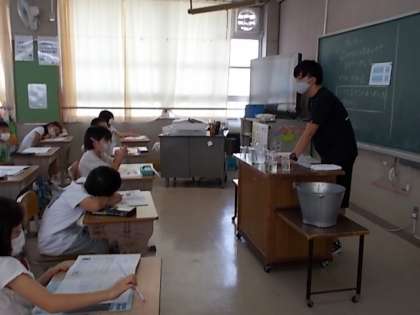 2組では,算数「水のかさ」という単元に入りました。先生が,水をビーカーに入れて1Lの入れ物に移し替えて,量を確認できました。具体物を使って,勉強するとわかりやすいですね。