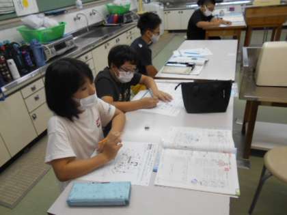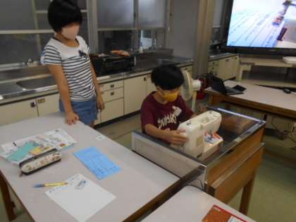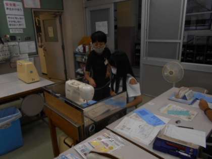家庭科の時間では,家庭科室に入る前に手洗い,アルコールを済ませミシンについて勉強しました。空縫いの仕方を学び次回の本縫いにむけて,グループで使い方を確認しました。