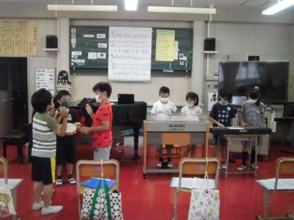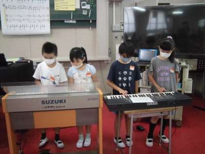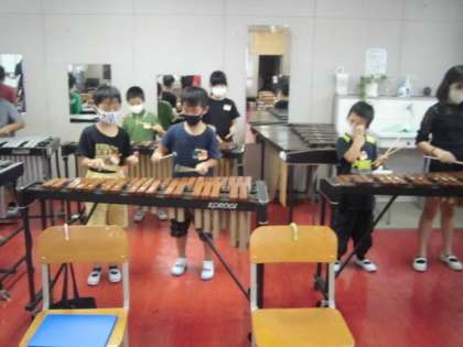 音楽室のいろんな楽器を使って演奏しています。音がばらばらにならないよう,2拍子の拍に合わせられるよう。練習をがんばっています。