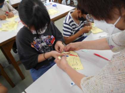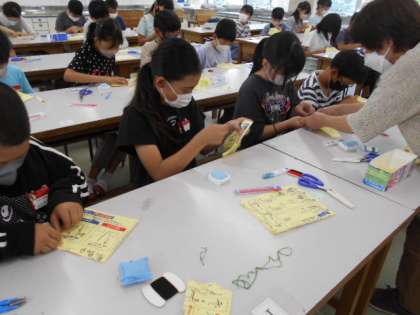 家庭科の学習がありました。前回習った玉どめ・玉結びを使って名前となみ縫いを練習しました。