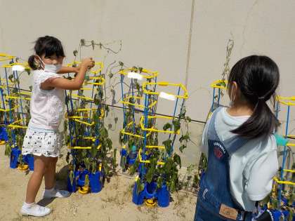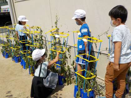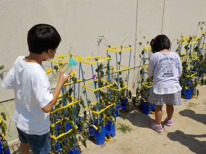 毎日暑くて,アサガオさんも暑い暑いと言っています。子どもたちは頑張って水やりをしています。きれいな花が咲き始めています。