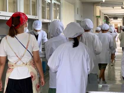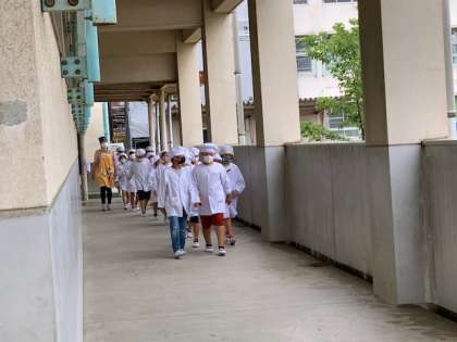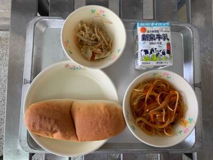 本日のメニューは「なすとトマトのスパゲティ・和風サラダ・コッペパン・牛乳」でした。
