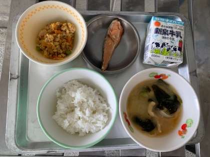 本日のメニューは「みそ汁・そぼろ丼・鮭の風味焼き・ごはん・牛乳」でした。