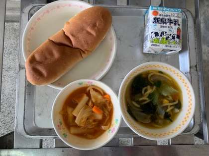 本日のメニューは「コーンラーメン・トッポギ・黒糖パン・牛乳」でした。
