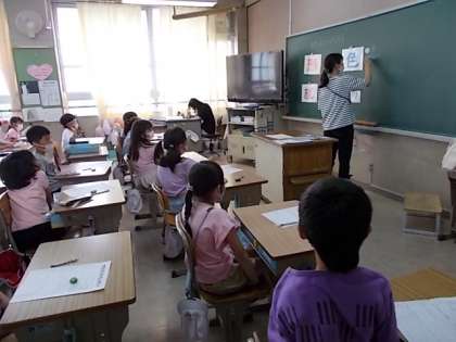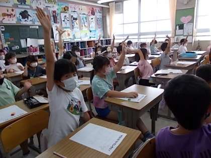今日は,栄養教諭の先生が,食育のお話をしにきてくださいました。2年生は,いま野菜を育てています。その野菜をよく知ろうという授業でした。味や形,色など,話しあいました。どんなふうに料理して,おいしくいただけるでしょうか。夏野菜がよくとれる時期ですね。 ご家庭でも,野菜をたくさん食べて,もっと健康になりましょう!