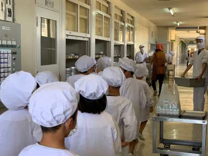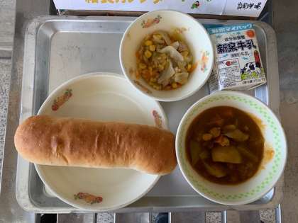 本日のメニューは「ひよこまめのカレー・コーンキャベツ・コッペパン・牛乳」でした。