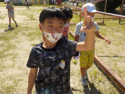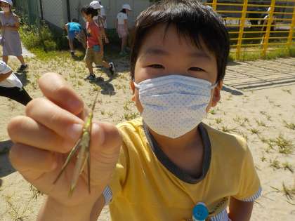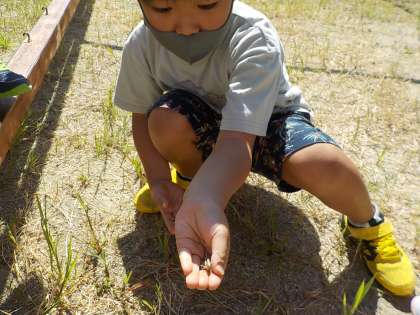 生活科の学習で,小さな虫を探しに行きました。バッタとトンボがたくさんいました。セミのぬけがらもありました。つかまえた後は,友だちに見せて,優しく草むらに返してあげていました。