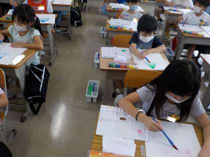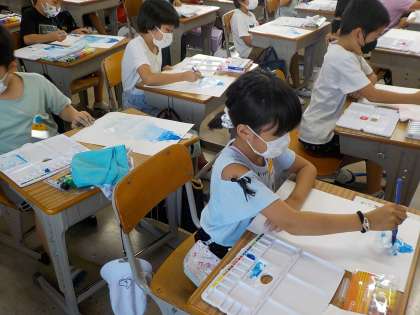 初めての絵の具の学習でした。道具の置き場所,絵の具の出し方,筆の使い方,塗り方等,先生の説明をしっかり聞いて,学習することができました。色の濃淡を使って,かき氷を描きました。